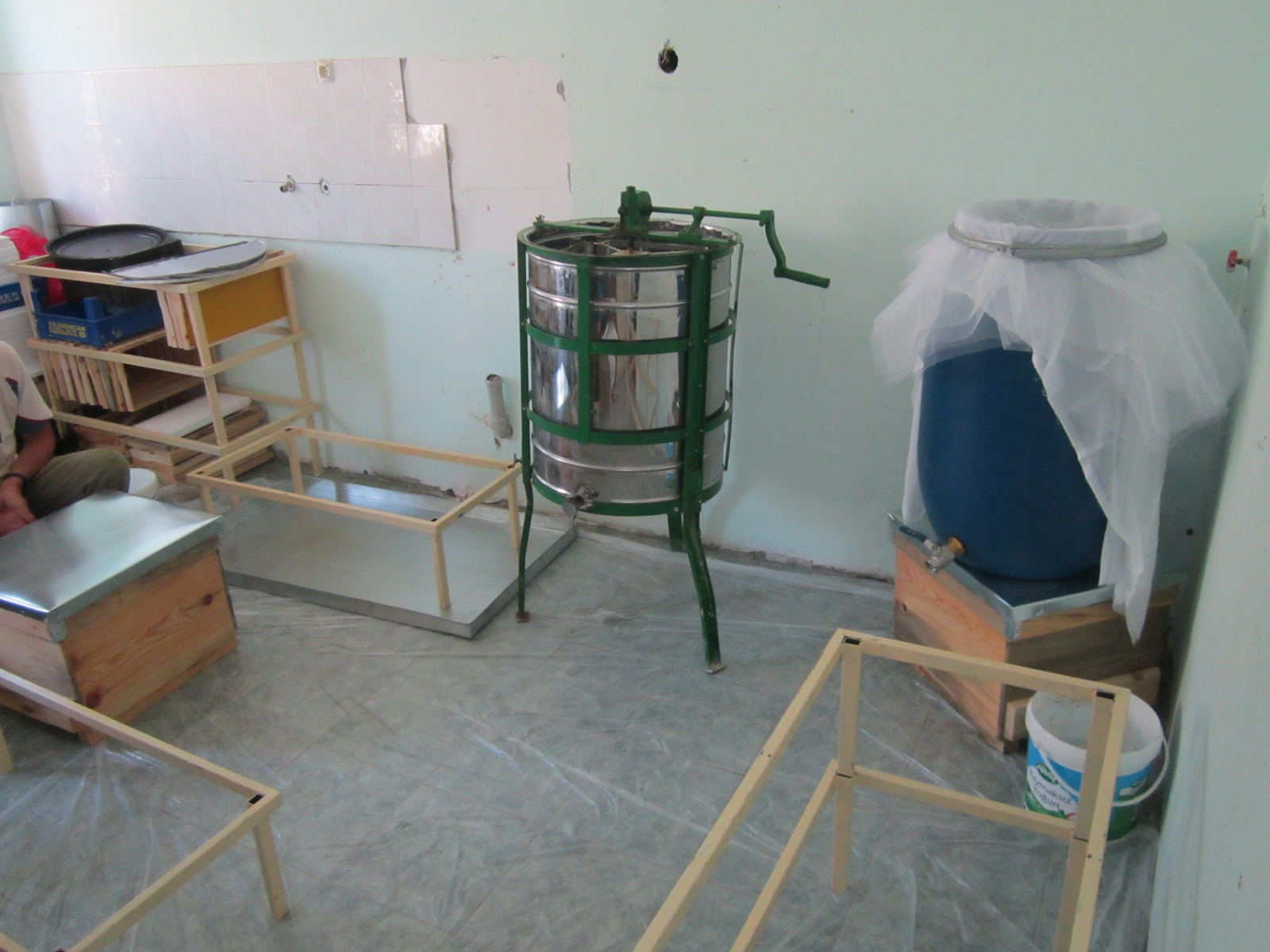 Bal süzeceğimiz yeri sabah ekip gelmeden hazırladık.Zemine büyük bir naylon örtü serdik.Gerekli tüm ekip manı yerleştirdik.Tam olarak gözükmüyor ama,Birol abi ve demlik çayıda hazır.Onlar Fikri abi ile içerdeler.Sırları kesip,süzecekler.